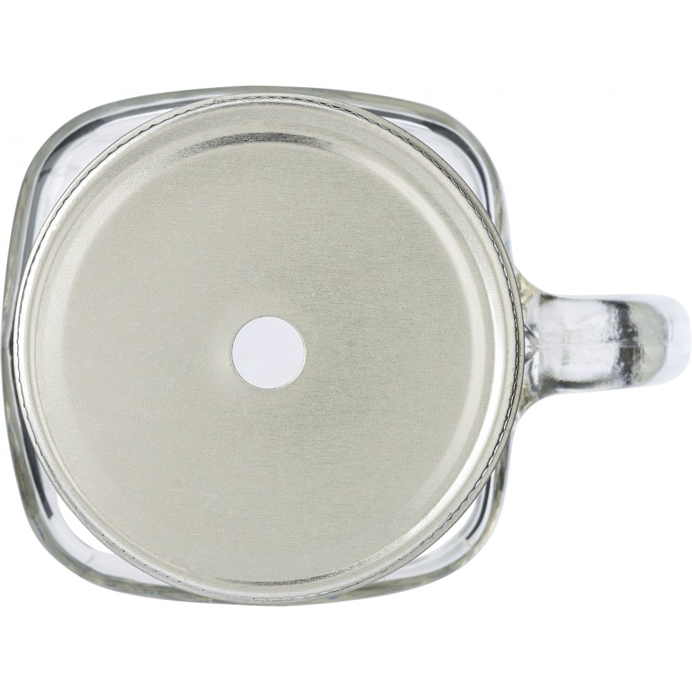 Üvegkorsó ezüst színű fedéllel, szívószállal. 400 ml űrtartalom. Emblémázható felület: 40 x 50 mm. BPA-mentes műanyag.