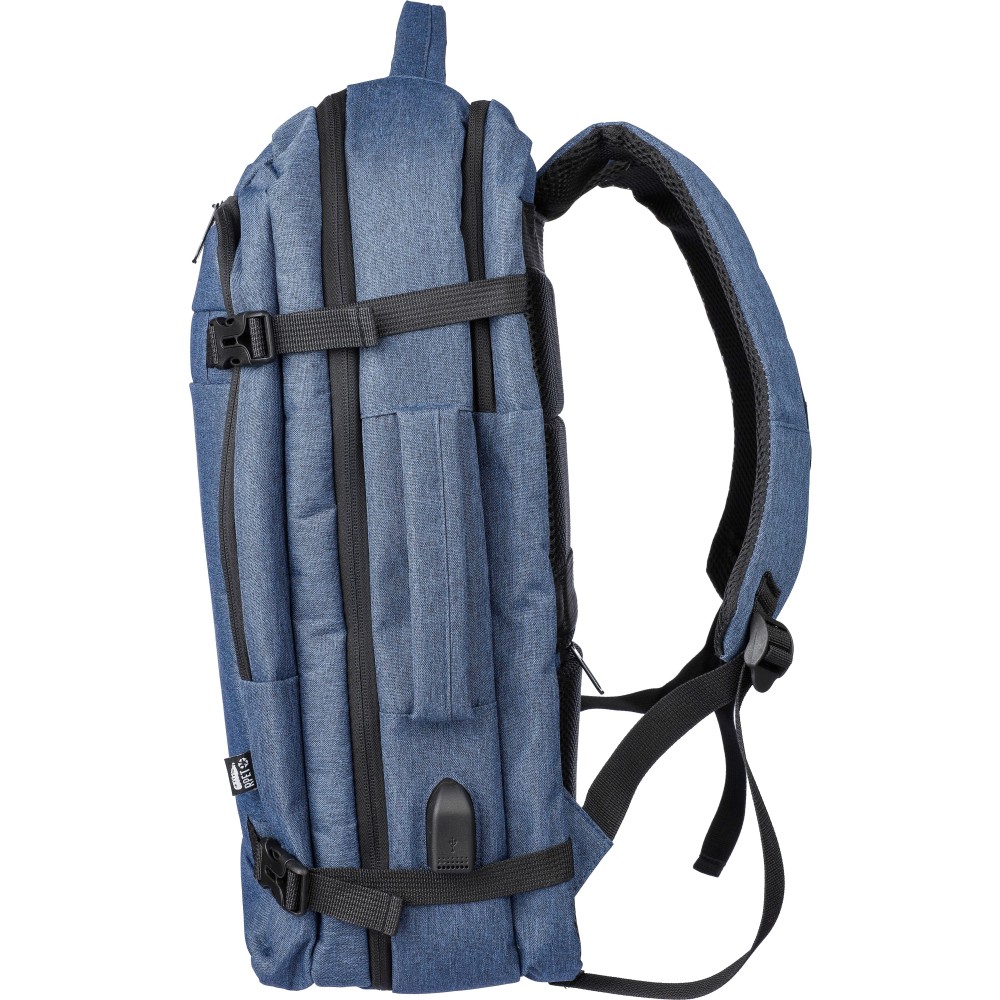 Hátizsák és laptoptáska 17 -es készülékhez. Kézipoggyász méretű. Hordozófüllel a tetején és oldalain. Tépőzáras laptop rekesszel, lopásgátló zsebbel és két nagy cipzáras rekesszel. Szellőző, párnázott hátoldallal, bőröndre húzható pánttal, zárócsatokkal és oldalsó USB-A porttal rendelkezik. Oldalsó csatok segítik a csomag kompakt tartását. Terhelhetősége kb. 12 kg. RPET alapanyagra utaló címke. Anyaga: 300D rPET poliészter.