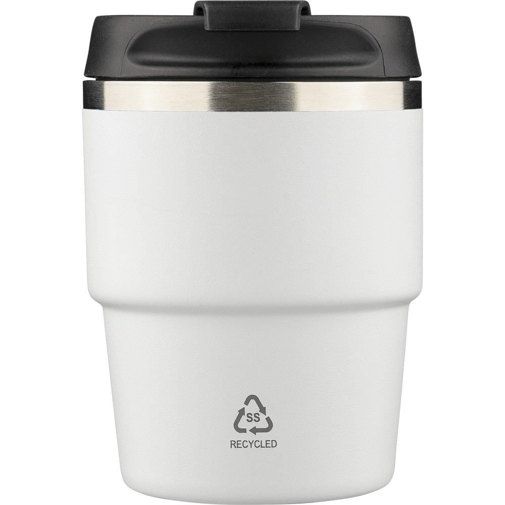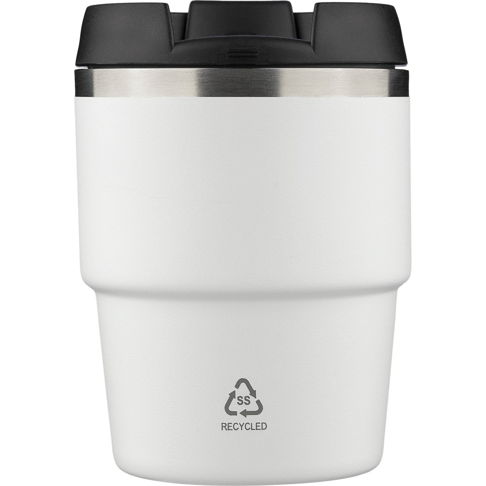 Újrahasznosított rozsdamentes acélból készült, vákuumszigetelésű bögre (175 ml) duplafalú kialakítással és porfestett felülettel, PP csavaros fedéllel. A pohártesten lézergravírozott recycled (újrahasznosított) alapanyagra utaló logó található. Kompakt kialakítása miatt a legtöbb kávégépbe illeszkedik, darabonként barna kartondobozba csomagolva szállítjuk.
