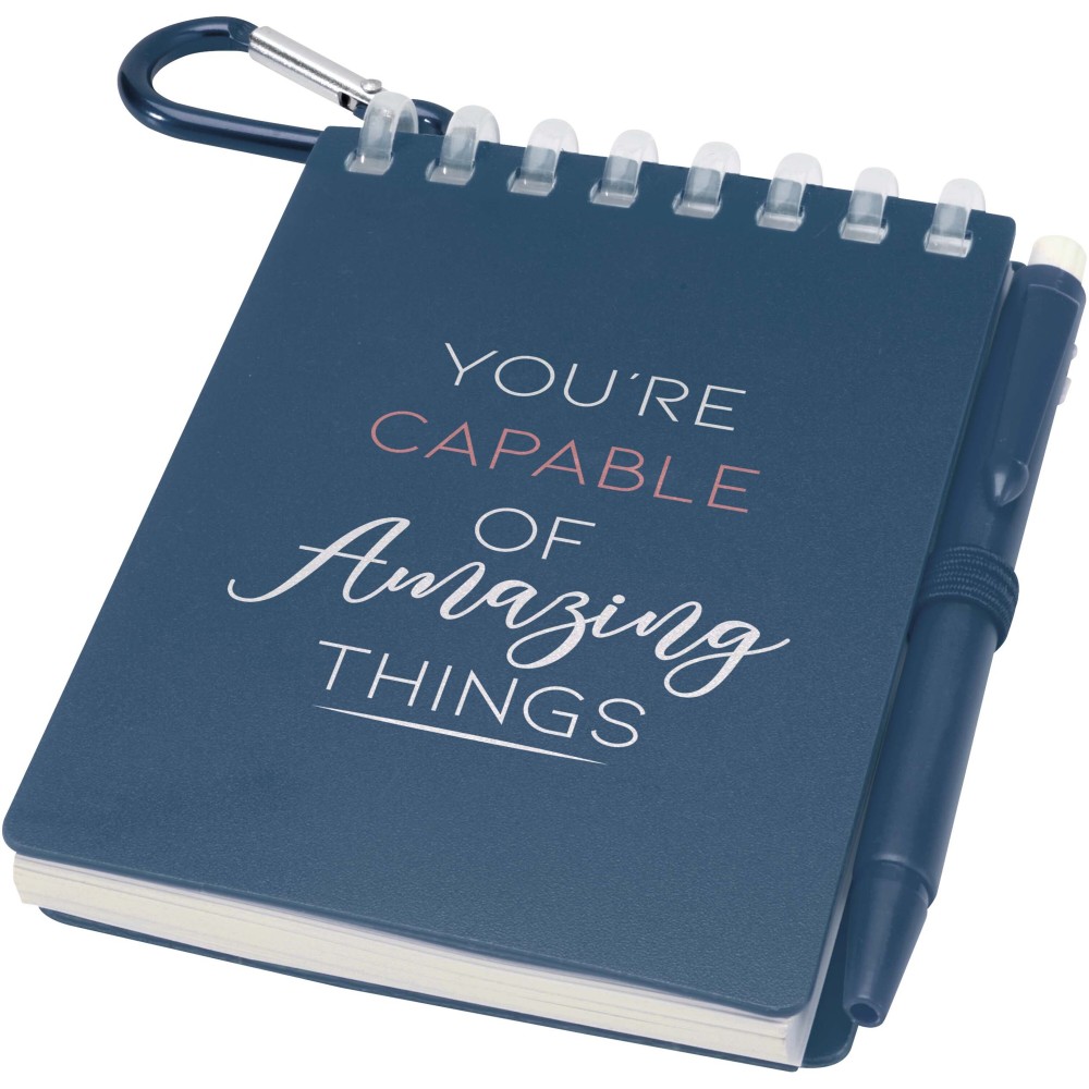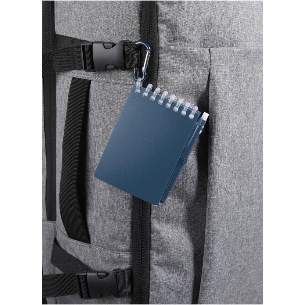 A Lig Mini jegyzetfüzet és toll szett kompakt és praktikus társ a gyors jegyzeteléshez útközben. A spirálfüzet puha, újrahasznosított műanyag borítással és 70 darab, 120 g/m2 súlyú, vízálló kőpapírból készült üres lappal rendelkezik, így ideális választás szabadtéri használatra is. A kerekített sarkokkal és beépített tolltartó pánttal ellátott kiegészítő tökéletesen követi a "mini" trendet, miközben teljesen funkcionális marad. A szetthez tartozó golyóstoll újrahasznosított ABS műanyagból készült, fekete tintával ír, íráshossza pedig 250 méter. A színben harmonizáló fémgyűrű segítségével a szett könnyen rögzíthető hátizsákra, táskára vagy kulcscsomóra, így tartós és hordozható megoldást nyújt a jegyzetek rögzítéséhez. A jegyzetfüzet mérete: 11 × 7,5 cm.