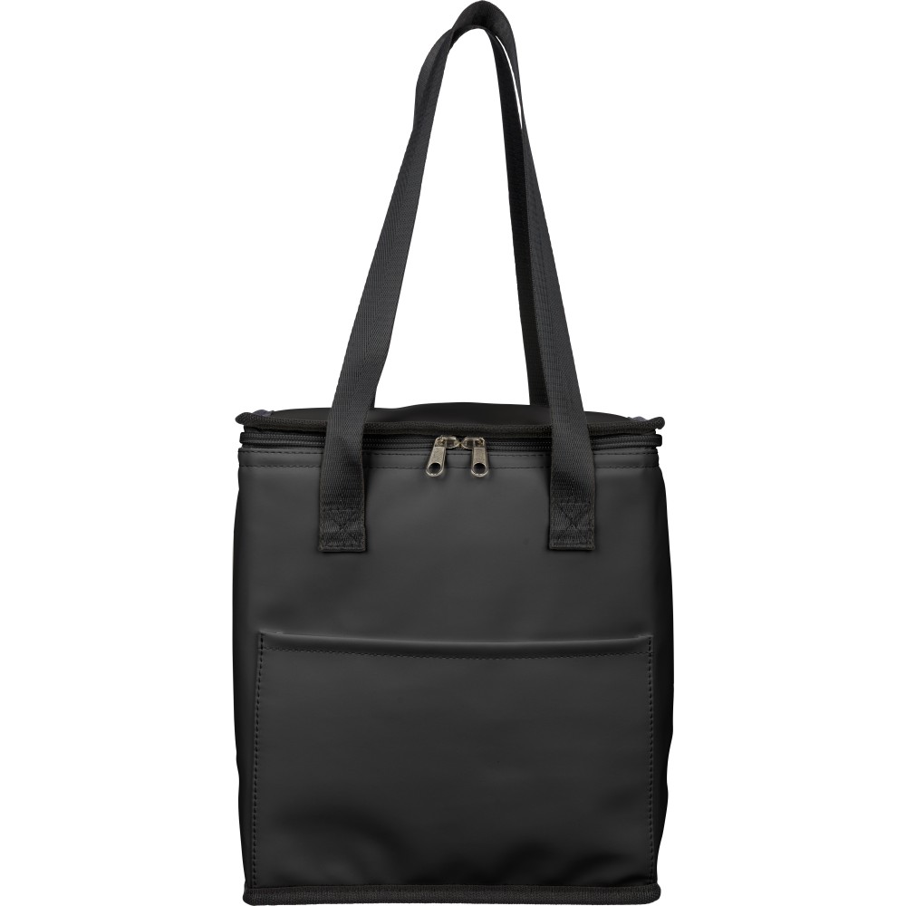 Újrahasznosított PU anyagból készült hűtőtáska 9 literes űrtartalommal, 210D újrahasznosított poliészter béléssel. 2,5 × 66 cm méretű hosszú fülekkel és elülső tárolózsebbel rendelkezik. A belső címkén újrahasznosított alapanyagra utaló logó található.